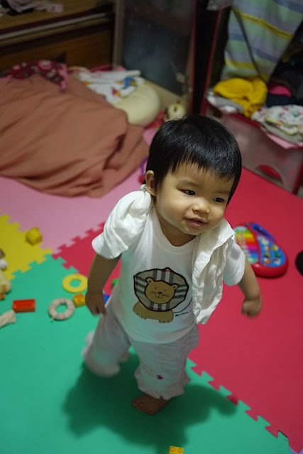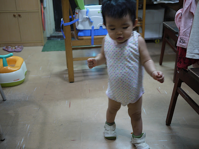 | 一歲快3個月,開始練習放手走路!真的是「舉步惟艱」,踏出的每一步都好不容易啊!! |